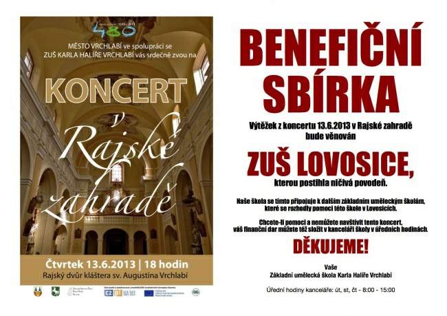 Město Vrchlabí ve spolupráci se ZUŠ Karla Halíře uspořádali v krásném prostředí Rajské zahrady Augustiniánského kláštera tradiční koncert žáků a učitelů školy. Výtěžek z dobrovolného vstupného je věnován ZUŠ Lovosice, kerou postihla ničivá povodeň.