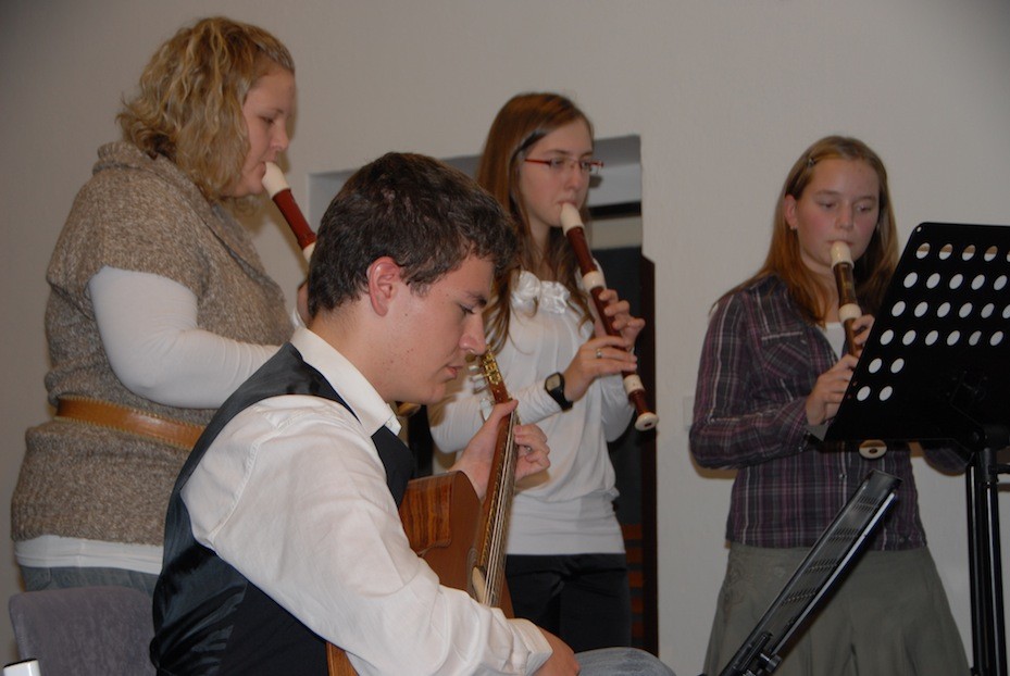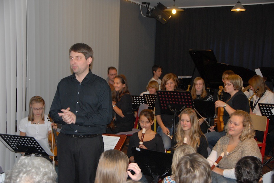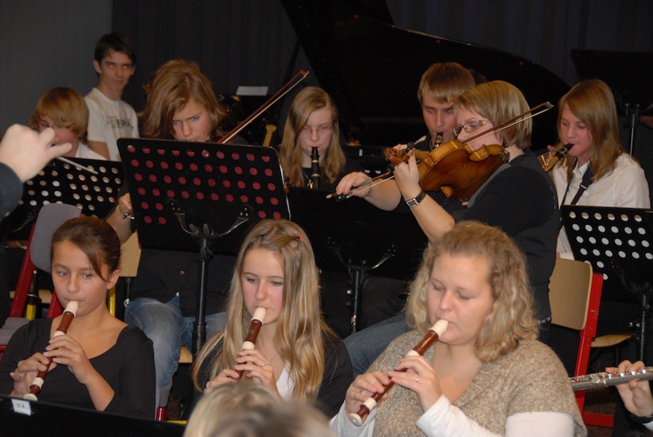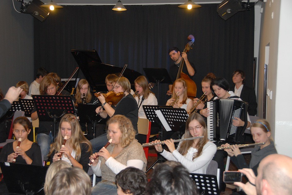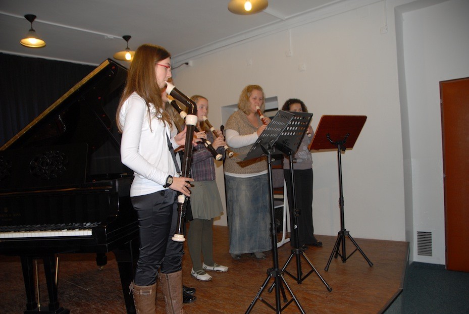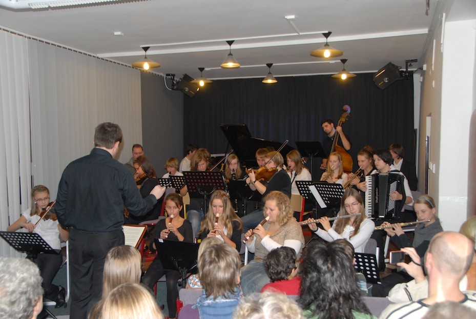 Obrázky z Koncertu žáků, na kterém poprvé vystoupil Školní orchestr.