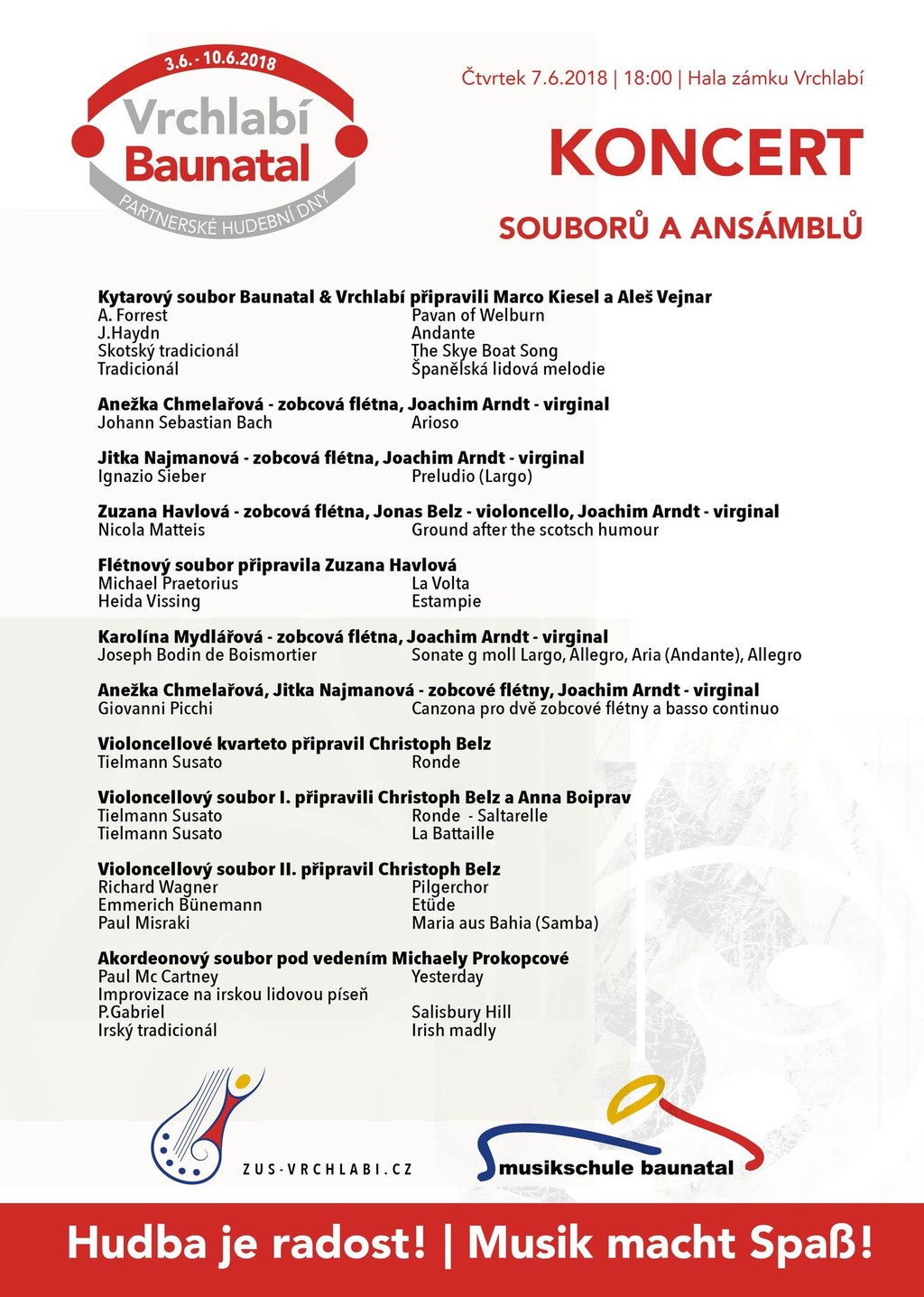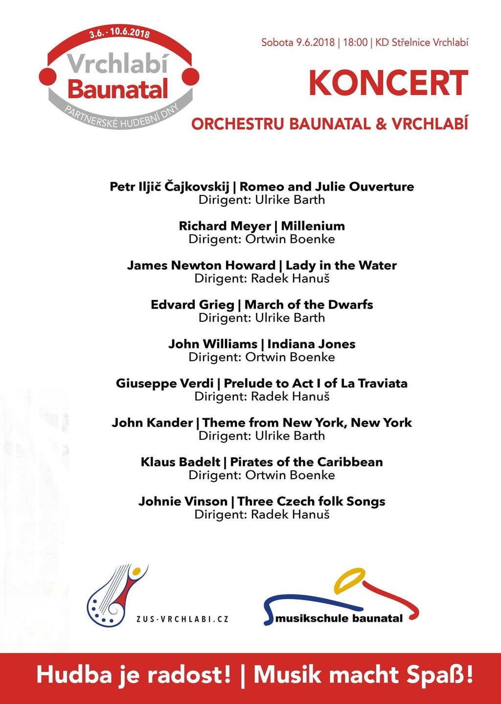 V týdnu od 3. do 10.6.2018 hostila naše škola přátele z partnerské hudební školy v německém Baunatalu. Během týdne jsme tradičně nacvičili spoustu krásné hudby pro dva koncerty (koncert jednotlivců, souborů a ansámblů v hale zámku a koncert orchestru v KD Střelnice). Závěr našeho společného muzicírování patřil děkovné bohoslužbě v kostele sv. Vavřince, která byla věnována partnerství obou uměleckých škol. Těšíme se na další společná setkávání!!!