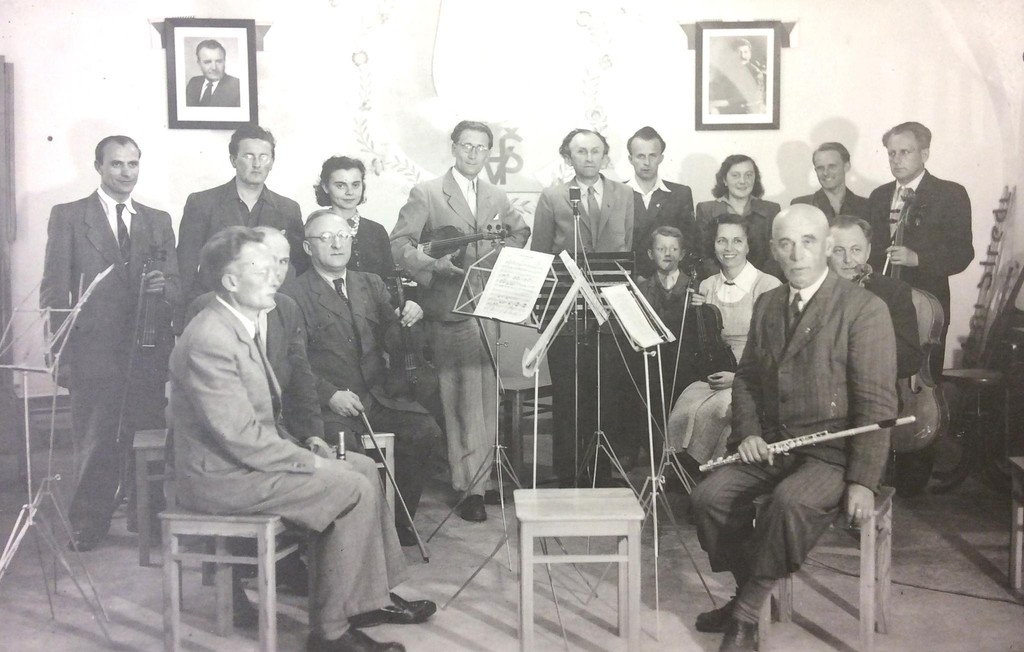 Stojící zleva: Frant. Rejl - 1. housle, Augustin Růžička - kontrabas, Julie Rothová - harmonium, Viktor Kastner - viola, J.V.Kratochvíl - dirigent, Lešek Krejčí - zpěv, tenor, Ladislava Setničková - klavír, Dr. Jiří Havel - violoncello Sedící zleva: klarinety - p. Janda a p. Košťál, Josef Kinčl - 2. housle, žák Růžička, Jarmila Stefanovová - housle, Jan Jiránek - flétna, František Egerer - 1. housle