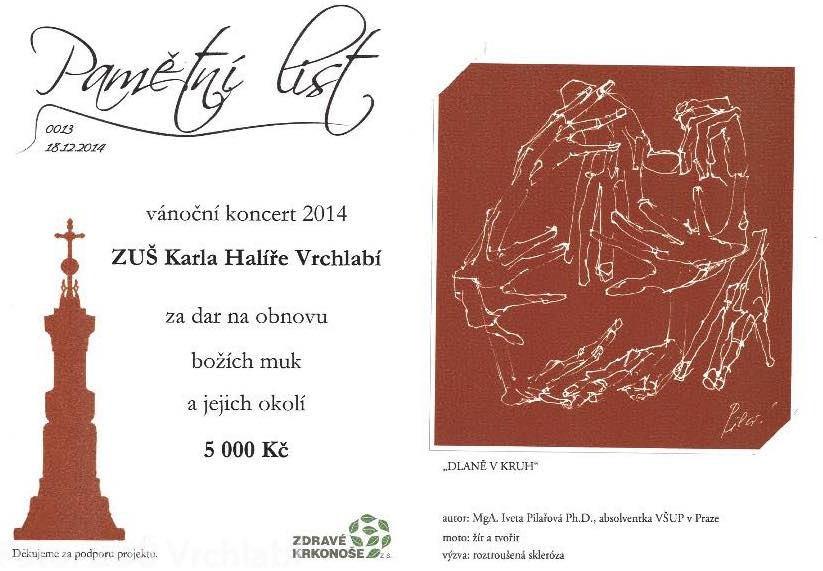 Výtěžek z tradičního Štěpánského koncertu byl v letošním roce věnován občanskému sdružení Zdravé Krkonoše a to na podporu opravy Božích muk v ulici Pod Parkem ve Vrchlabí. Účinkovali: Lenka Šimůnková - zpěv, Michaela Prokopcová - zpěv, Jana Kracík - zobcová flétna, Karolína Součková - příčná flétna, Monika Bucharová - violoncello, Michaela Beránková - varhany, Ondřej Mejsnar - varhany, Štěpán Buchar - kytara, Radek Hanuš - varhany