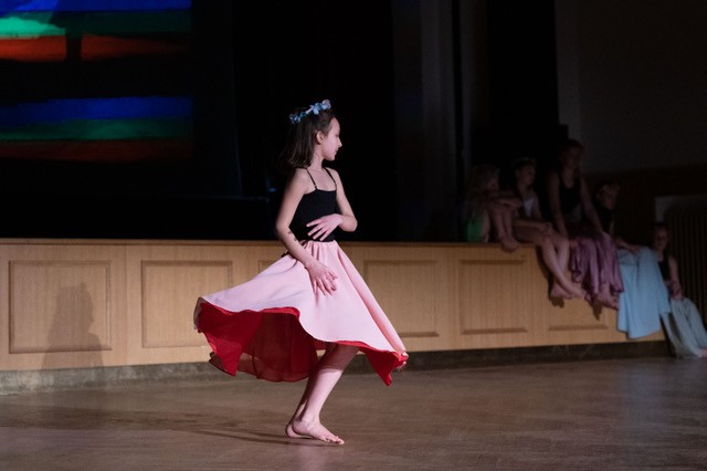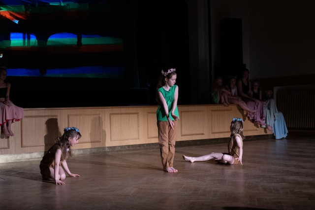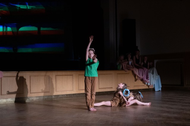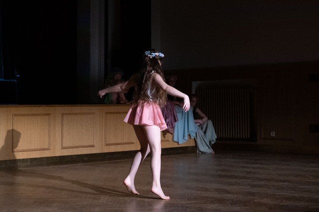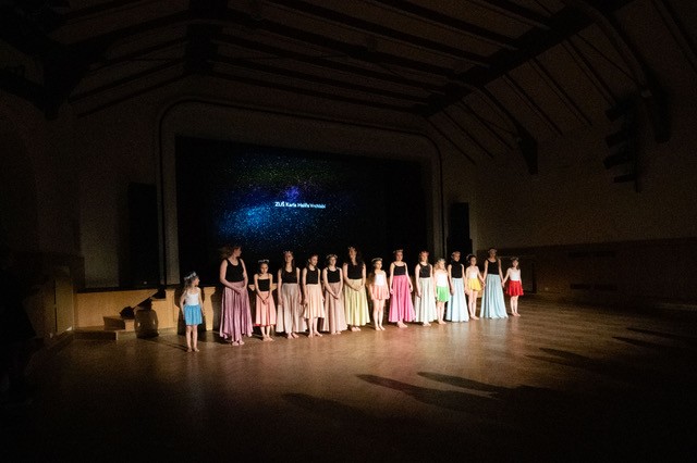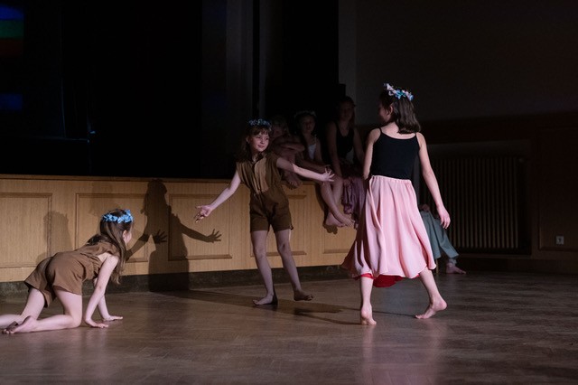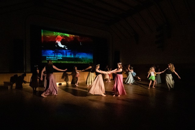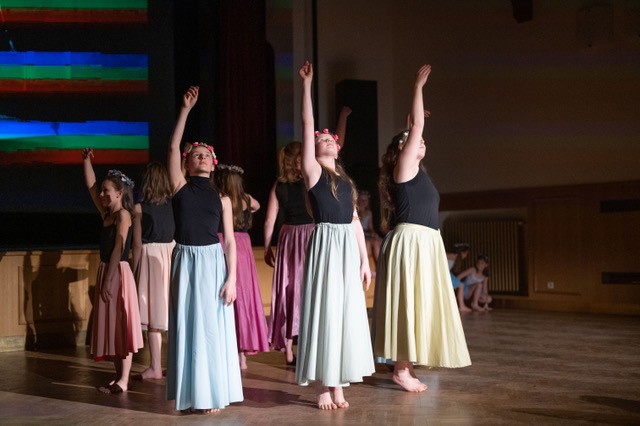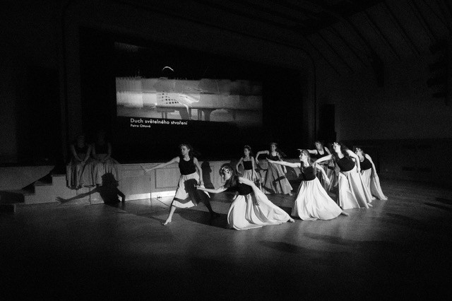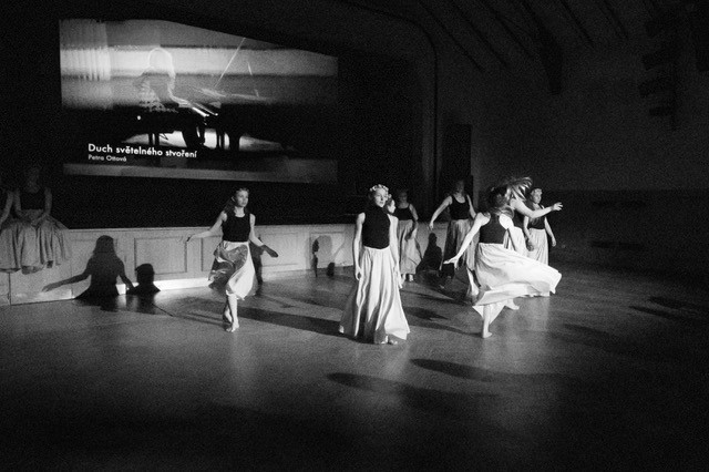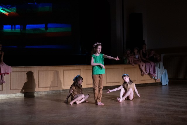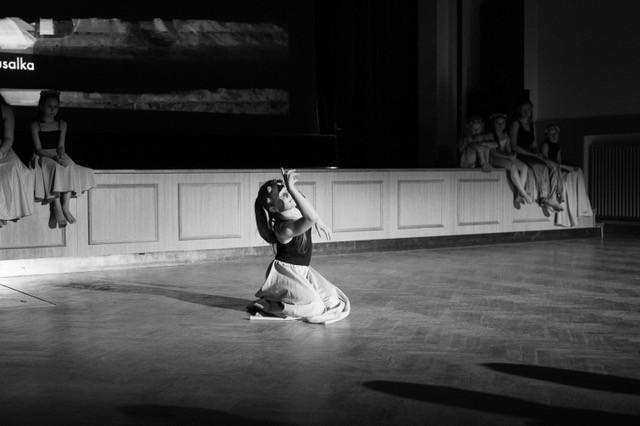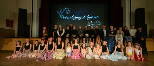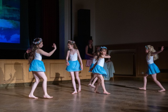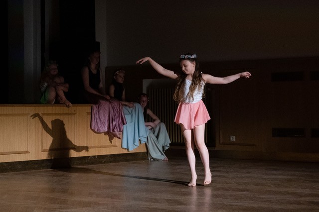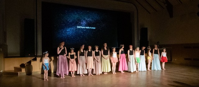 foto: Lucie Blažková Klavírní improvizace žáků Štěpánky Hrubecké na téma" bájných bytostí" (skladby žáků byly natočeny na kameru a promítány na projekční plátno), ve spolupráci s vystoupením Tanečního oboru pod vedením Kristýny Hebelkové a průvodním slovem Literárně-dramatického oboru pod vedením Přemka Jirana. "V tanečním oboru jsme s jednotlivými skladbami pracovali různým způsobem. Inspirovaly nás také texty ke skladbám, které nám pomohly v rozhodnutí se, buď pro skupinovou nebo sólovou choreografii. Podle toho, kolik postav v příběhu vystupuje. Žákyně tak měly možnost pracovat i individuálně, zapojit vlastní potenciál a kreativitu. I když byla každá skladba jinak dlouhá a dynamická, obecně na nás působily spíše melancholicky, až tajemně a v tomto duchu se nesl i tanec dívek." Kristýna Hebelková