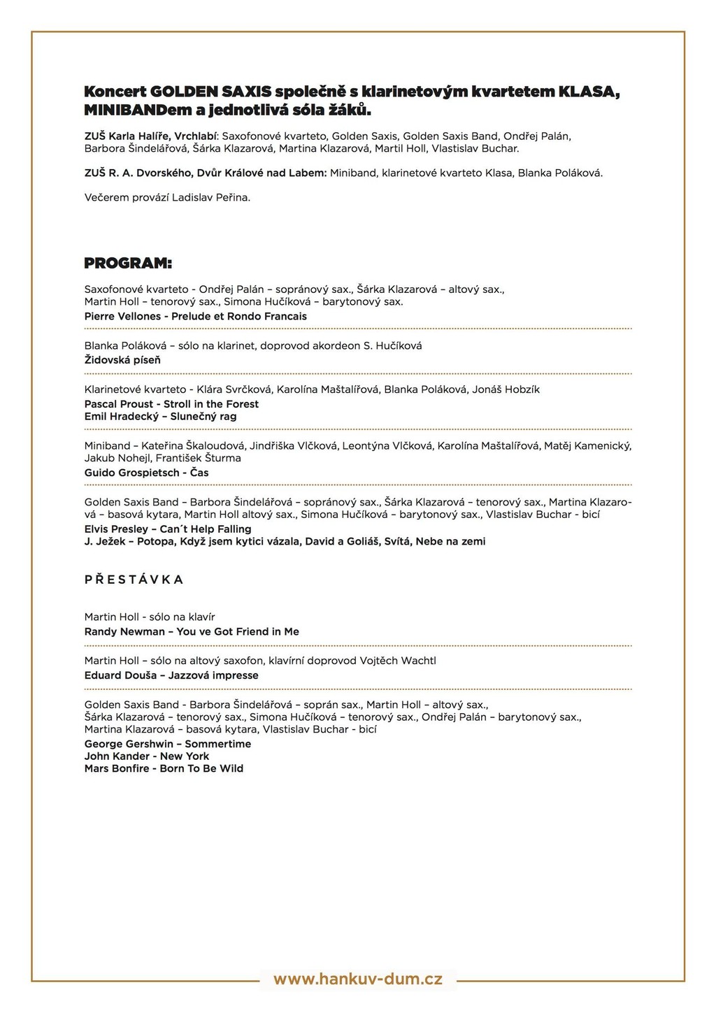 28. května 2022 se v Kulturním zařízení Hankův dům ve Dvoře Králové uskuteční v rámci 27. ročníku festivalu Dny R.A.Dvorského tradiční Přehlídka mladých talentů. V letošním roce zde vystoupí saxofonové kvarteto Golden Saxis, které doplní klarinetové kvarteto KLASA a mladí sólisté ze třídy Simony Hučíkové ze ZUŠ R.A.Dvorského ze Dvora Králové.
