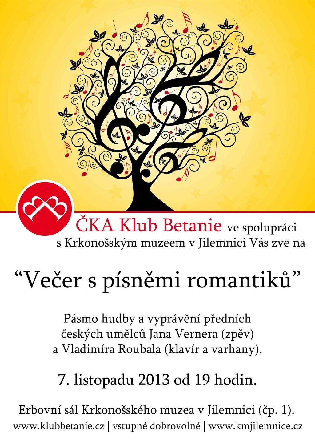 ČKA klub Betanie Jilemnice ve spolupráci s Krkonošským muzeem v Jilemnici vás zve na pásmo hudby a vyprávění předních českých umělců Jana Vernera (zpěv) a Vladimíra Roubala (klavír, varhany).