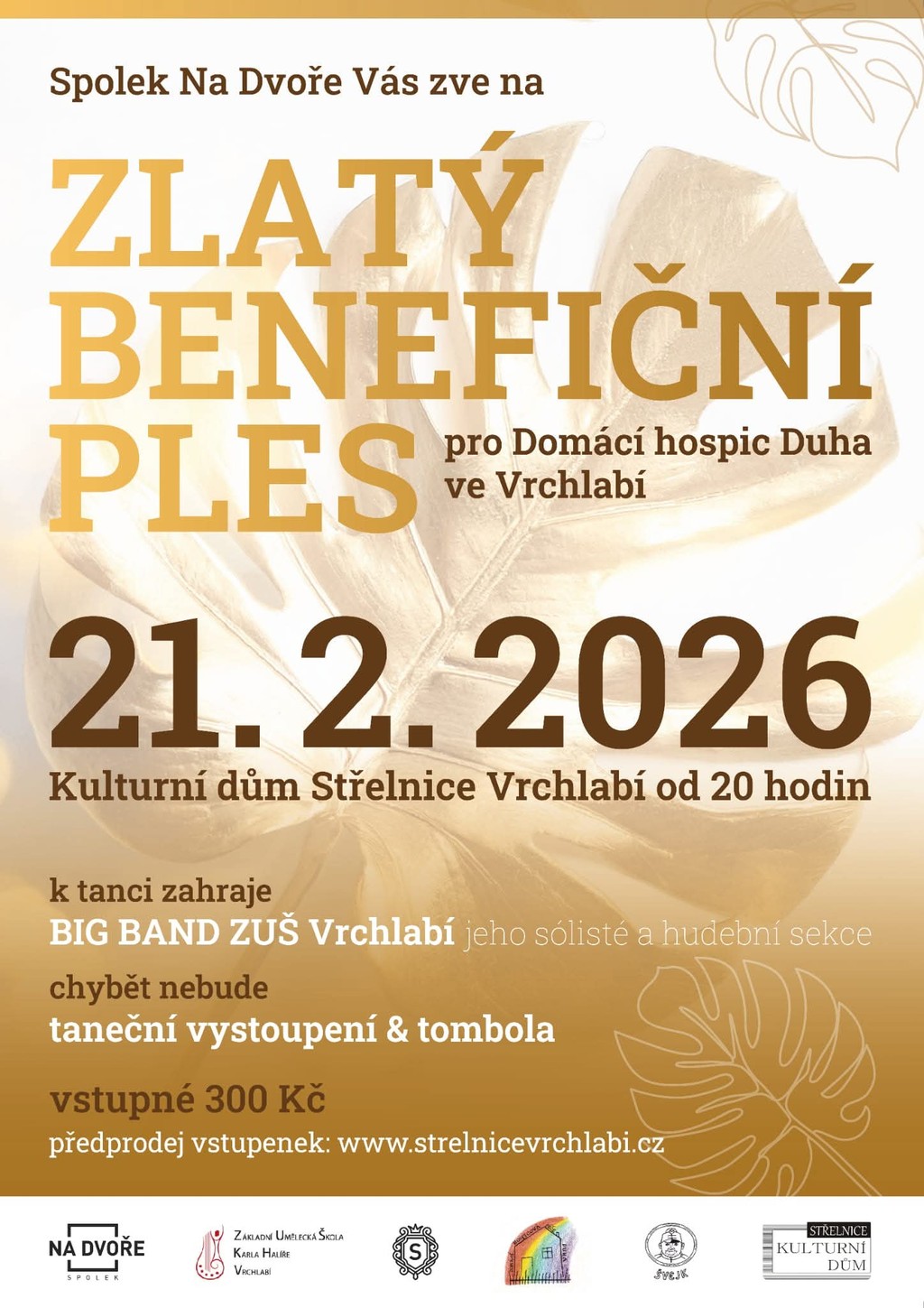 Spolek Na Dvoře Vás srdečně zve na Zlatý benefiční ples, který se uskuteční 21. února 2026 od 20.00 hodin v Kulturním domě Střelnice ve Vrchlabí.