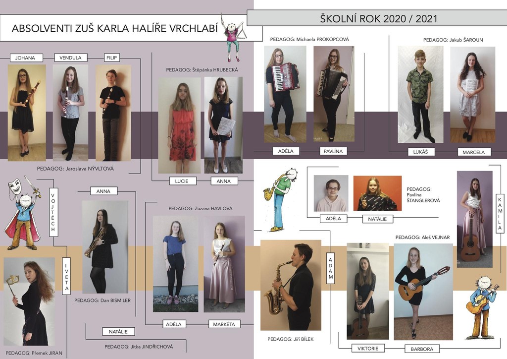 Vážení rodiče, žáci, přátelé! Je nám ctí představit Vám absolventy letošního školního roku. Měsíce květen a červen se zpravidla nesou ve znamení absolventských výkonů, jimiž tito žáci završí své studium v ZUŠ (ať už se jedná o uzavření sedmileté docházky I. stupně, nebo čtyřleté docházky II. stupně studia). Letošní rok nám nedovolí uspořádat absolventské koncerty "offline", proto se i nadále musíme spoléhat na podobu "online", a tímto Vás tedy zveme do naší nové videogalerie (zde i nas na youtube), kam budou postupně přibývat jednotlivé absolventské výkony těchto žáků. Všem absolventům přejeme mnoho zdaru!