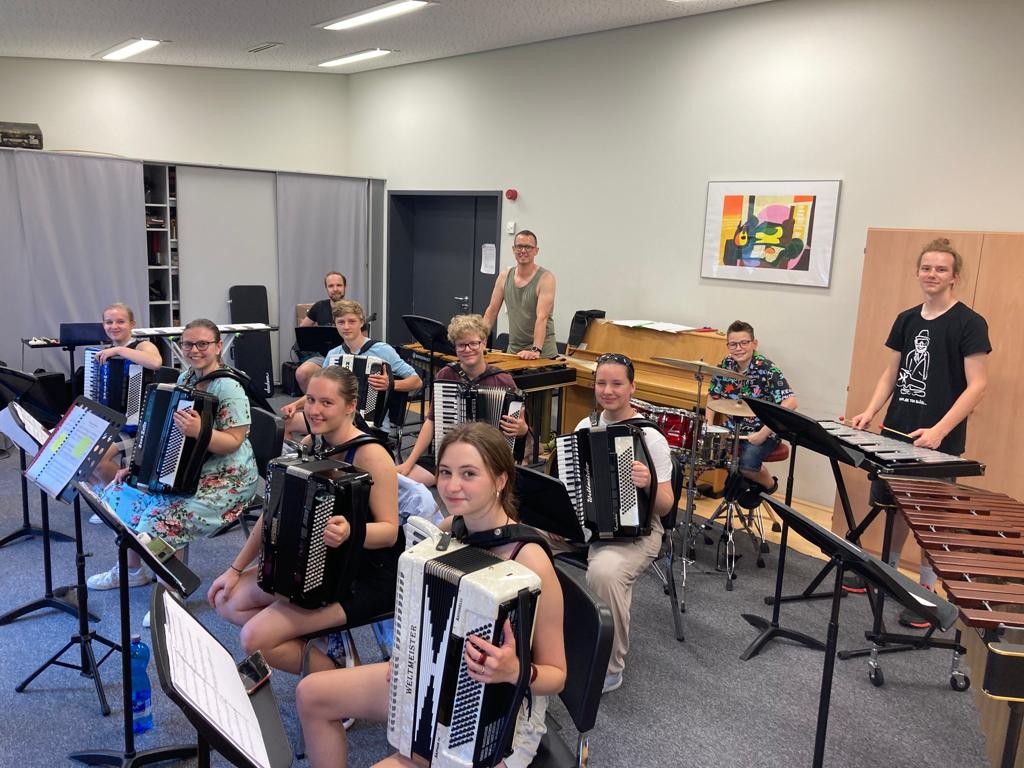 Dnes jsme začali zkoušet pěkně "zostra". Jak akordeonový soubor, tak orchestr - pustili jsme se do práce a s přestávkou na oběd jsme skončili až v půl odmé večer. Tedy 7,5 hodiny intenzivní přípravy skladeb na naše společné koncerty. Ale stálo to za to! Všichni unavení nejen z hraní, ale také z horka, které nám tu panuje. Večerní společná zkouška velkého orchestru s našimi baunatálskými přáteli ale stála za to!!! Zní nám to moc krásně, takže se nám lepší nálada a těšíme se na společné koncerty :-) Ve foyer Musikschule Baunatal je od dnešního rána nainstalována naše výstava reprodukcí obrazů našich žáků, kde jim předlohou byly vynikající obrazy krkonošského malíře Františka Kavána. Všichni výstavu obdivují, což nám dělá velkou radost :-)