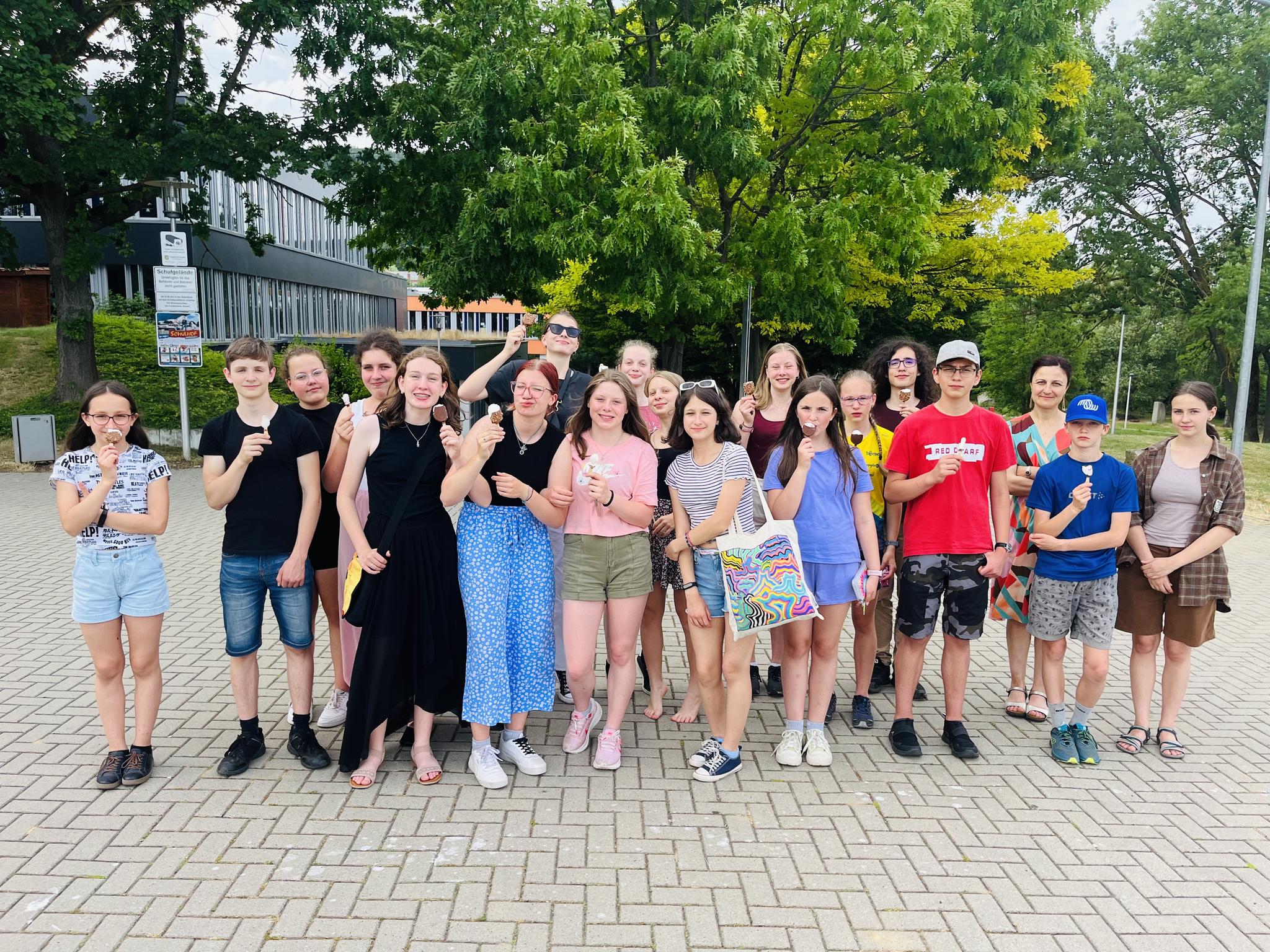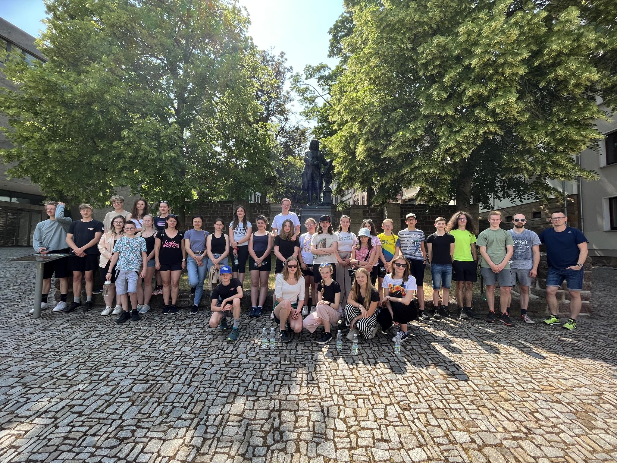 Je neděle 18.6.2023 a my vyrážíme v počtu 33 žáků a učitelů naší školy za našimi přáteli do partnerského města Baunatal. Cesta nám utekla dobře, máme perfektního řidiče :-) V autobuse je dobrá nálada, někdo spí, někdo nespí, někteří si povídají a někteří se učí malovat, protože s námi jede poprvé paní učitelka Ivanka Blagoeva z výtvarného oboru. Povinnou odpolední zastávku jsme tradičně absolvovali u rodného domu Johanna Sebastiana Bacha v Eisenachu, také s povinnou fotkou :-) odtud vyběhla pětice odvážlivců (Matěj Hájek, Maty Kettner, Dan Mejsnar, Honzik Mejsnar, Vláďa Sůsa a Radek Hanuš) na 2 km dlouhý výběh na hrad Wartburg se slušným převýšením - letošním výhercem se stal Matěj Hájek s časem 14 minut, druhým Maty Kettner. Nicméně bylo rozhodnuto, že tento závod "O baunatálský kebab" vyhráváji všichni závodníci, protože bojovali všichni pěkně a zaslouží si cenu za běh v tak úmorném vedru. Po společné tradiční fotce na hradních schodech třetího nádvoří hradu Wartburg jsme všichni opustili toto krásné místo, opět sešli do údolí a zamířili na poslední 2 hodiny cesty do Baunatalu. Zde nás už čekali naši přátelé - po srdečném přivítání, rozdělení do rodin a ubytování jsme všichni zmoženi cestou zalehli s očekáváním dalších dobrodružství, která nám další den chystá...Tak to byl den první...