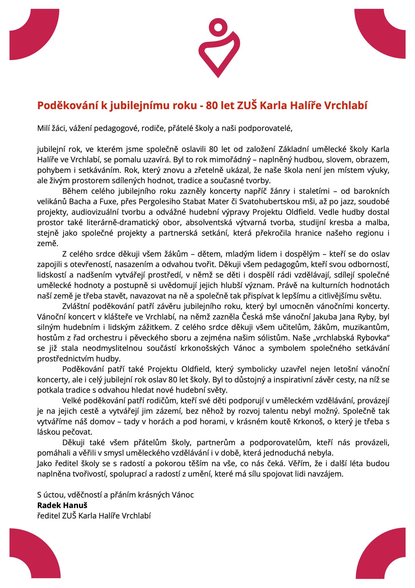Poděkování k jubilejnímu roku - 80 let ZUŠ Karla Halíře Vrchlabí
