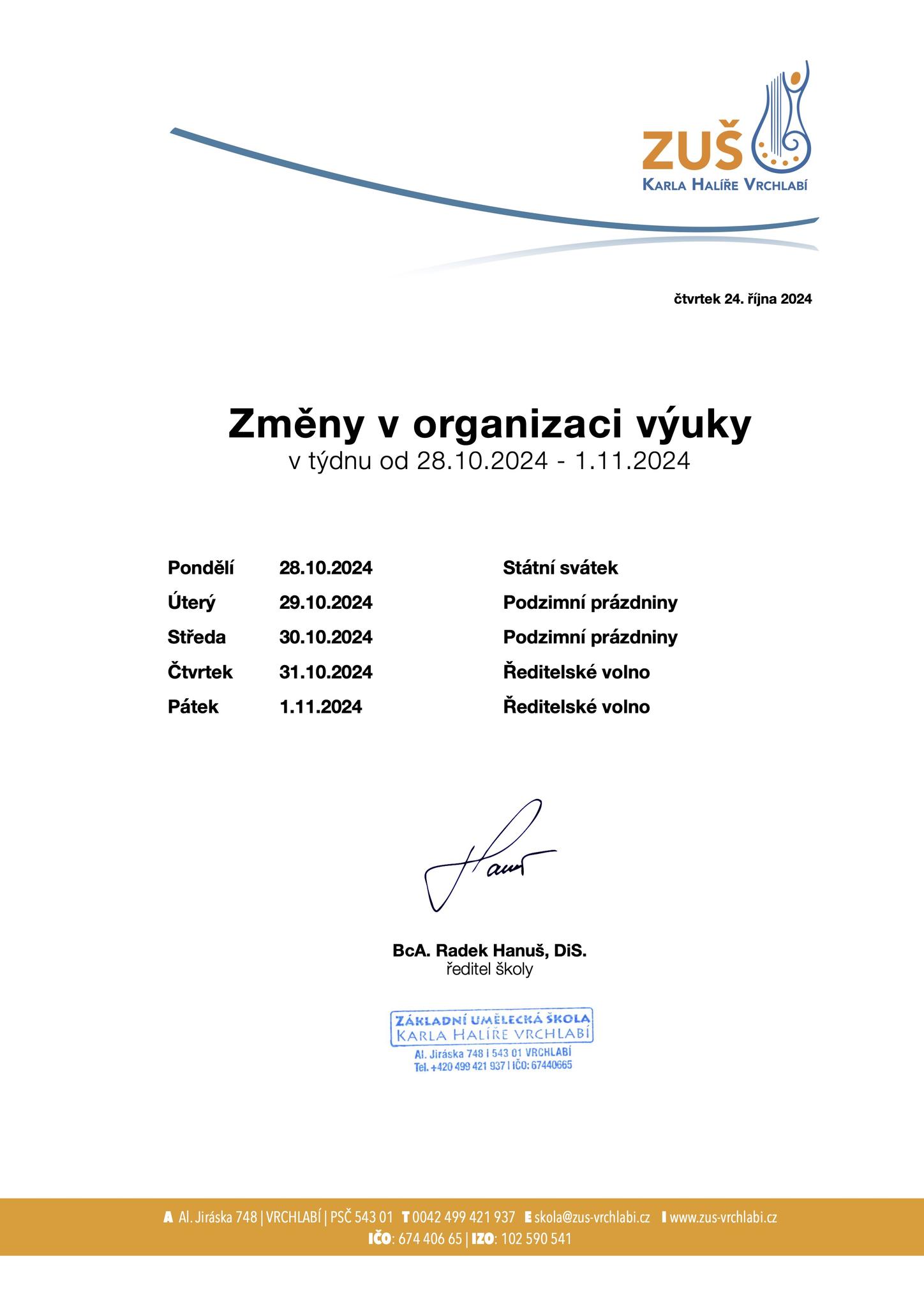 Změny v organizaci výuky v týdnu od 28.10.2024 - 1.11.2024